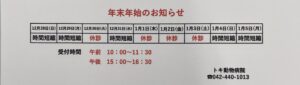 未分類 年末年始の診療時間変更に関するお知らせ 2025.12.24 2025年12月28日(日)~2026年1月5日(月)までの間、時間短縮診療を行います。 この期間、診察時間は午前10時~11:30、午後は15時~16:30までとなります。 当期間の休診日は ・12/30(火) ・1/1(木) ・1/2(金) ・1/3(土) です。 ご来院の際には確認の上、御来院いただきますようよろしくお願いいたします。 (現段階で予定の段階ですので若干の変更がありえます。来院前にもう一度確認の上ご来院ください) Tweet Share Hatena Pocket RSS feedly Pin it 11/6(木)診察時間について 前の記事
